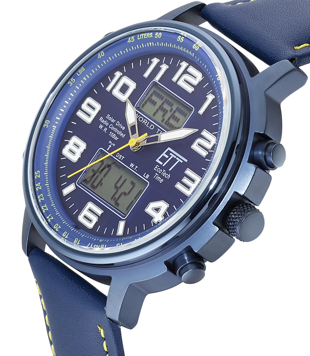 Eine sportlich, modisch aktuelle Herrenuhr mit blauem Zifferblatt und Solar-Funk-Antrieb sowie World Timer- und weiteren Funktionen wie Tag-/Datums-/Jahresanzeige und Beleuchtung. Die Eco Tech Time Solar Drive Hunter II Herrenuhr EGS-11450-32L hat bis zu 6 Monate Dunkelgangreserve. Das Gehäuse ist aus Edelstahl, das Band aus Leder. Die Wasserdichtigkeit beträgt bis zu 10 bar. Nie mehr Batteriewechsel!