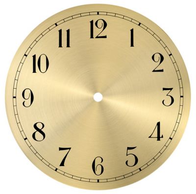 Goldfarbenes Zifferblatt aus Aluminium der Stärke 0,5 mit arabischen Ziffern und Minuteneinteilung am äußersten Kranz. Außendurchmesser beträgt 220mm, mit Mittelloch.