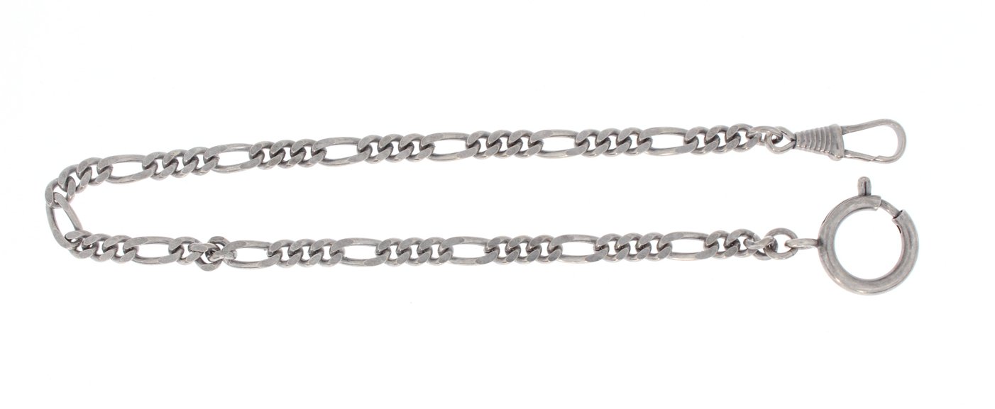 Taschenuhrkette, Figaro-Panzer, flach, Länge ca. 30cm, mit Karabinerhaken und Federringverschluss. Made in Germany.
