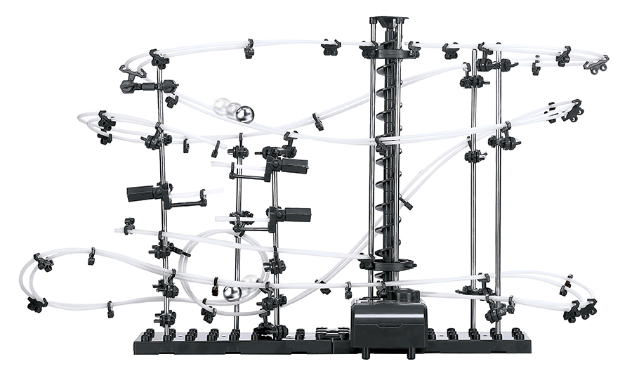 Aus den vielseitigen Bauteilen wird eine anspruchsvolle Kugelbahn konstruiert, auf der die mitgelieferten Metallkugeln in atemberaubendem Tempo hinuntersausen und im batteriebetriebenen Fahrstuhl landen, der sie wieder nach oben in ihre Startposition bringt.
