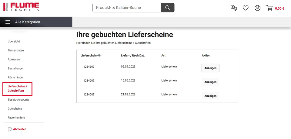 Unter dem Menüpunkt Lieferscheine/Gutschriften können Sie jederzeit Ihre aktuellen und vergangenen Lieferscheine (inkl. Auftragsnummer) aufrufen und ausdrucken.