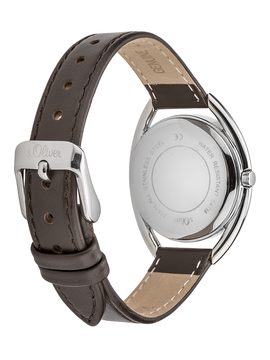 Edelstahlgehäuse poliert, kratzunempfindliches Mineralglas, Lederarmband mit Dornschließe, Gehäusegröße 32 mm, Bandbreite: 14 mm, Bandlänge: 70 x 115 mm, Wasserdicht 5 ATM. Verpackt in der original s. Oliver Geschenkverpackung.