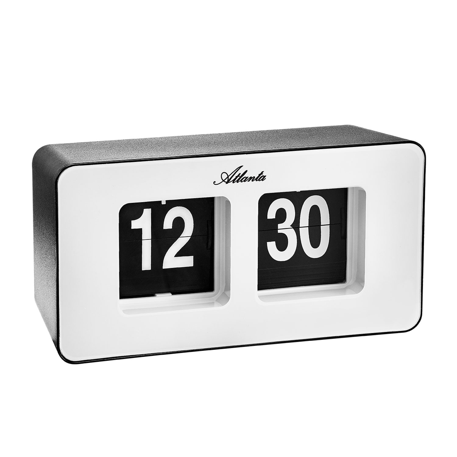 Quarz-Tischuhr, Retro-Design mit Flip-Anzeige, schwarz-weißes Kunststoffgehäuse.