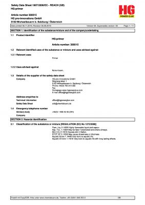 Hochkonzentriert - entfernt selbst hart gewordene Klebstoffreste!• OPTIMALER KLEBEERFOLG: Mit dem HG Cleaner befreist du die betroffenen Stellen von Schmutz und sorgst somit für die ideale Vorbehandlung.• ENTFERNT KLEBERESTE: Du entfernst Klebstoffreste von Tisch, Schrank, Fußboden und sogar aus Textilien.Fast wichtiger als der Klebstoff selbst!Mit dem HG Cleaner reinigst du zu verklebende Stellen gründlich und bereitest sie so optimal für den eigentlichen Klebevorgang vor. Der Cleaner ist gleichzeitig auch ein wirksamer Klebstoffentferner, mit dem du Klebstoffreste von Tisch, Boden und aus Textilien beseitigst. Die richtige Vorbereitung ist für optimale Ergebnisse beim Verkleben notwendig. Wir wagen sogar zu behaupten, dass sie wichtiger ist, als die Qualität des Klebstoffes selbst. Denn Öl, Fett, Schmutz, Rost usw. sind wahre Killer einer starken und dauerhaften Verklebung.Anwendung1. Verträglichkeit prüfenDen Cleaner auf einer kleinen und unauffälligen Fläche des entsprechenden Materials testen. Bei einer unerwünschten Reaktion sofort entfernen.2. Alte Klebstoffreste entfernen (optional)Sollten sich auf der zu verklebenden Stelle noch Klebstoffreste befinden, diese mit dem Cleaner beträufeln und einige Minuten einziehen lassen. Danach können die Reste mit einem sauberen Tuch entfernt werden.1. GrundreinigungFür die eigentliche Reinigung vor der Verklebung einfach ein paar Tropfen HG Cleaner auf ein Tuch geben und auf die zu verklebende Bruchstelle auftragen. Diese Grundreinigung ist notwendig, denn jegliche Verunreinigungen verschlechtern die Stabilität der Klebeverbindung.345868 - Cleaner - 20mlGefahrenhinweis:GEFAHR. Aceton. EthylacetatFlüssigkeit und Dampf leicht entzündbar. Verursacht schwere Augenreizung.Kann Schläfrigkeit und Benommenheit verursachen. Ist ärztlicher Rat erforderlich, Verpackung oder Kennzeichnungsetikettbereithalten. Darf nicht in die Hände von Kindern gelangen.Von Hitze, heißen Oberflächen, Funken, offenen Flammen sowie anderen Zündquellen fernhalten. Nicht rauchen.Behälter dicht verschlossen halten. Nur im Freien oder in gut belüfteten Räumen verwenden.Schutzhandschuhe / Augenschutz / Gesichtsschutz tragen. BEI KONTAKT MIT DEN AUGEN: Einige Minuten langbehutsam mit Wasser spülen. Eventuell vorhandene Kontaktlinsen nach Möglichkeit entfernen. Weiter spülen.Bei anhaltender Augenreizung: Ärztlichen Rat einholen / ärztliche Hilfe hinzuziehen.An einem gut belüfteten Ort aufbewahren. Kühl halten. Unter Verschluss aufbewahren.Inhalt/Behälter gemäß lokalen/nationalen Vorschriften der Entsorgung zuführen.Wiederholter Kontakt kann zu spröder oder rissiger Haut führen. UFI: D800-U0RP-S00J-1D60