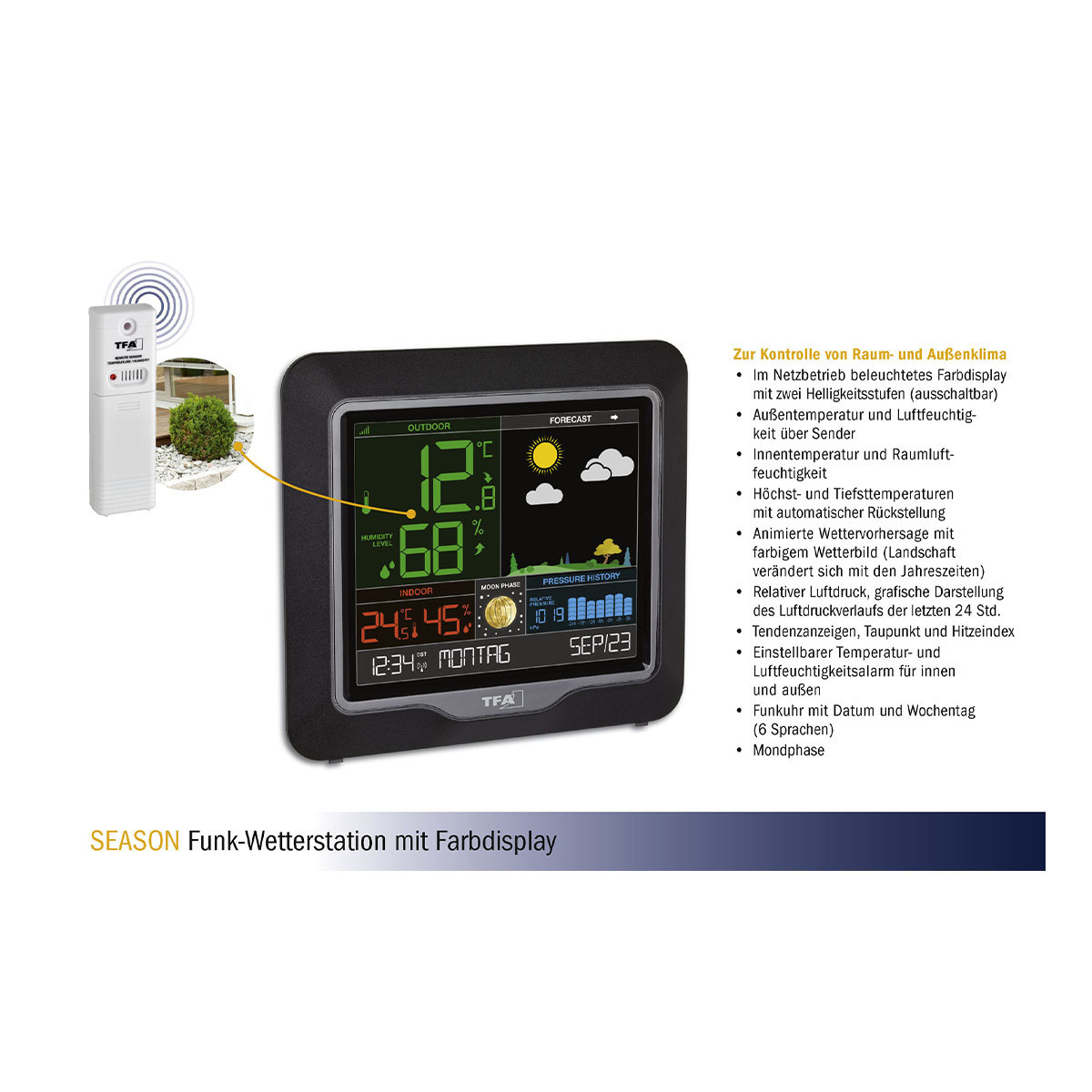 Die Wettersymbole erweitern die Anzeige und geben auf Basis der gemessenen Luftdruckveränderungen eine Prognose für das kommende Wetter. So sehen Sie auf einem Blick, ob Sie an den Sonnenhut oder Regenschirm denken sollten. Der aktuelle relative Luftdruck wird angezeigt; den Verlauf der letzten 24 Stunden kann man auf einem Balkendiagramm beobachten und sich so ein genaueres Bild über die Wetterentwicklung machen. Die Außentemperatur und Luftfeuchtigkeit vor Ort werden über einen eigenen Funksender ermittelt.