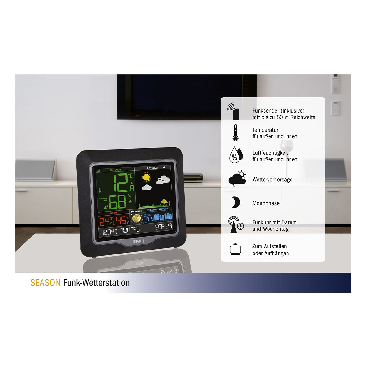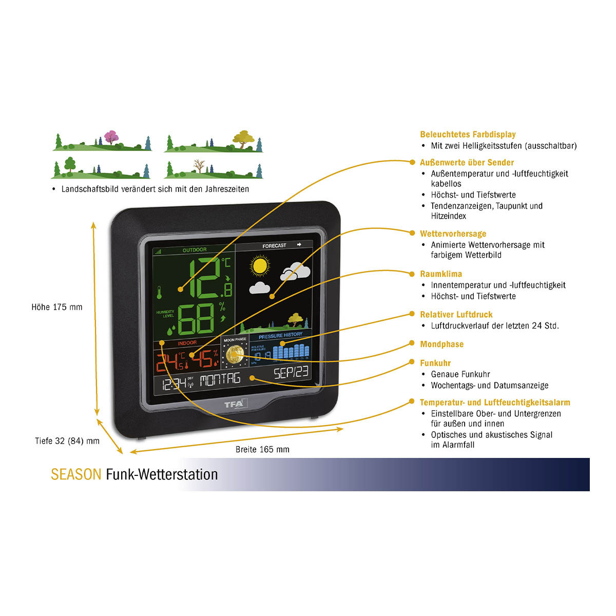 Lust auf Veränderung? Die Wetterstation SEASON schafft Abwechslung, denn das Wetterbild verändert sich nicht nur mit der Vorhersage, je nach Jahreszeit erscheint die Landschaft in Frühlingsblüte, mit sommerlichem Grün, goldenem Herbstlaub oder winterlich karg.