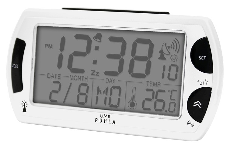 UMR radio controlled alarm clock with large LC display, calendar, temperature and radio signal display, white