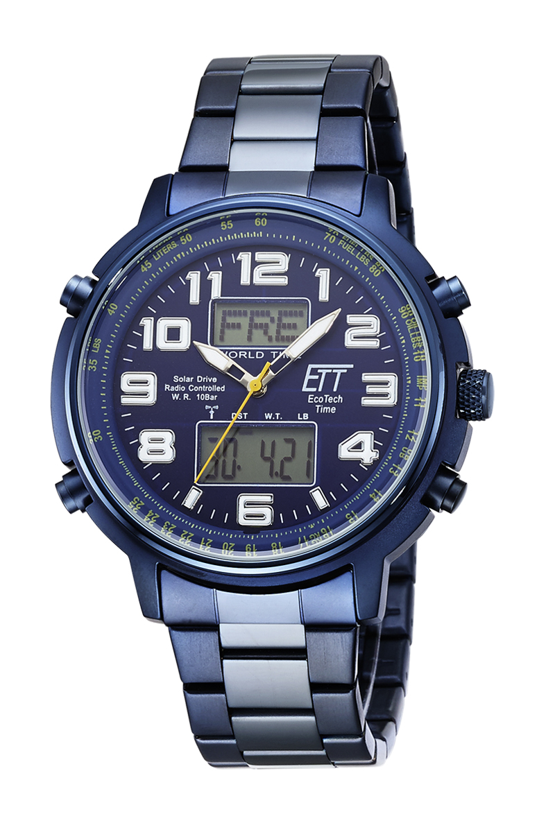 A sporty, fashionably up-to-date men's watch with a blue dial and solar radio drive, as well as world timer and other functions such as day / date / year display and lighting. The Eco Tech Time Solar Drive Hunter II men's watch EGS-11445-32ML has a dark power reserve of up to 6 months. The case and the bracelet are made of stainless steel. The water resistance is up to 10 bar. No more changing batteries!