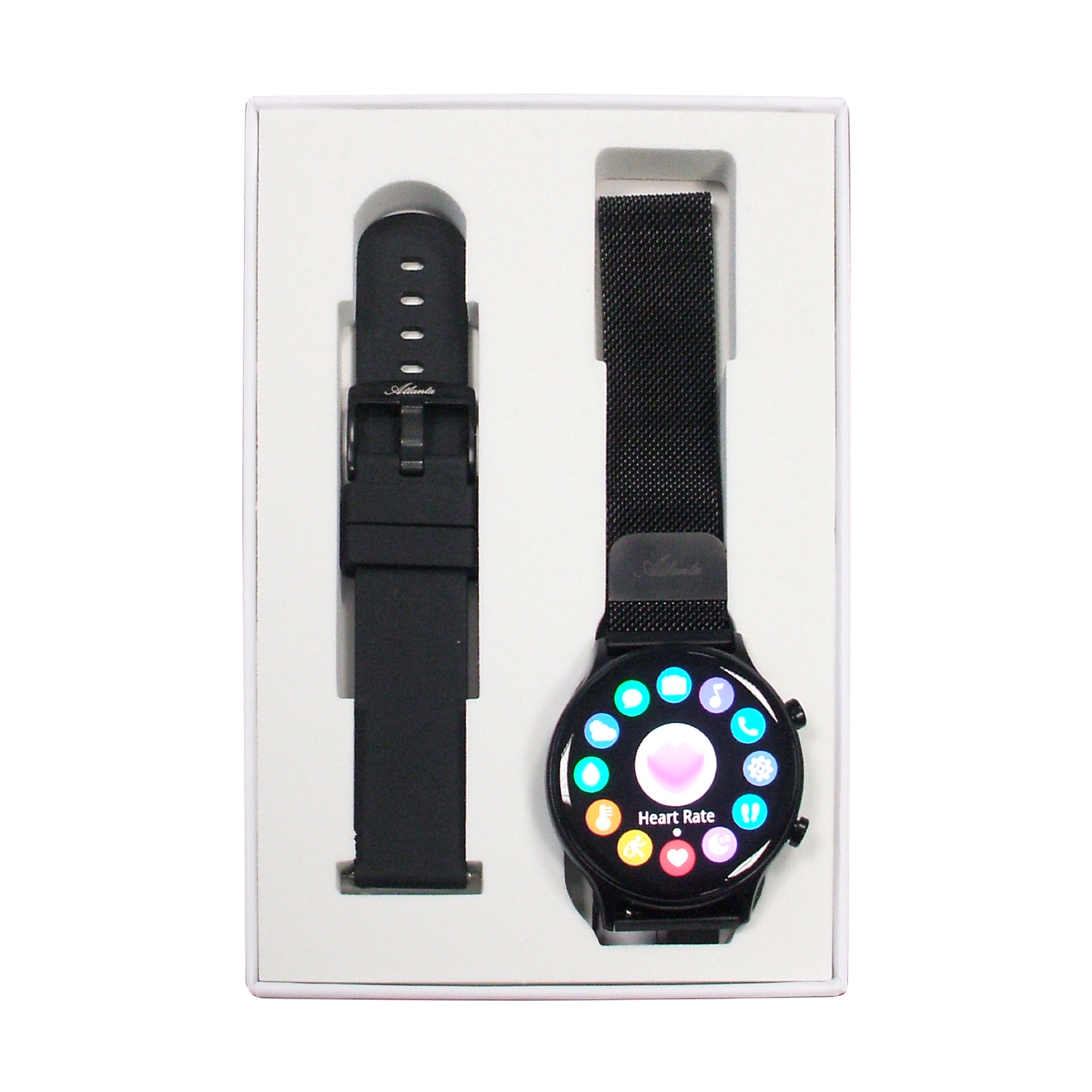 - Scope of delivery: 1 smartwatch black, mesh strap with magnetic clasp black + extra silicone strap black + 1 charging clip USB + instruction manual