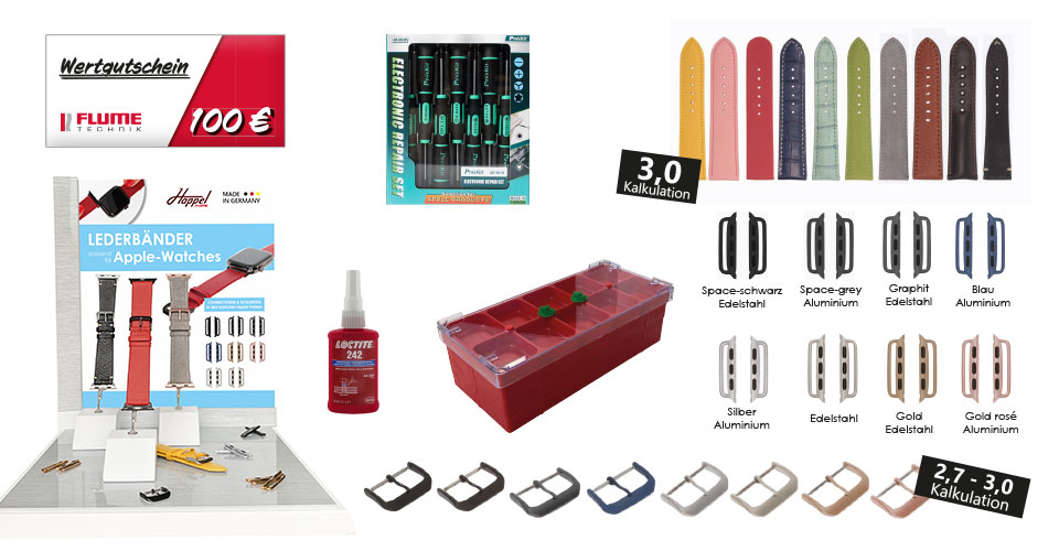 Met ons eerste starterspakket in de branche, spring je mee op de Apple-trein. Dat betekent: Je breidt de horlogeservice uit op een manier die zowel kwalitatief doelgericht, als zeer interessant is voor elke Apple Watch-drager, die op zoek is naar een nieuwe, hoogwaardige band voor zijn Smartwatch. Vooral in tijden van online handelen kan dit een doorslaggevend voordeel zijn. Als vertrouwde juwelier kunt u toch bieden wat een klant niet of nauwelijks op internet kan vinden: klasse in plaats van massa! Deze klasse wordt vooral geïllustreerd door onze populaire Happel leren bandjes, die geschikt zijn voor Apple Watches en worden gekenmerkt door hun onvergelijkbare kwaliteit, wat betekent dat ze 'Made in Germany' zijn. Met deze juwelierskwaliteit achter je, kun je de nieuwsgierigheid van Apple-klanten opwekken en ze uiteindelijk terug naar de winkel brengen.