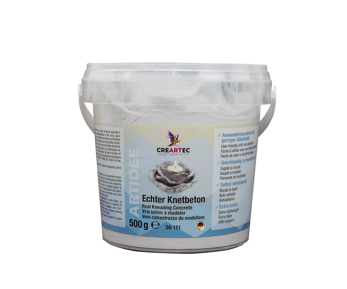 Het wordt gemengd in een verhouding van 1 deel water en 3 delen betonpoeder, goed kneden en is nu onmiddellijk klaar voor gebruik. Het resultaat is een perfect te modelleren, soepel te verwerken, vormstabiel "echt Kneedbeton".
