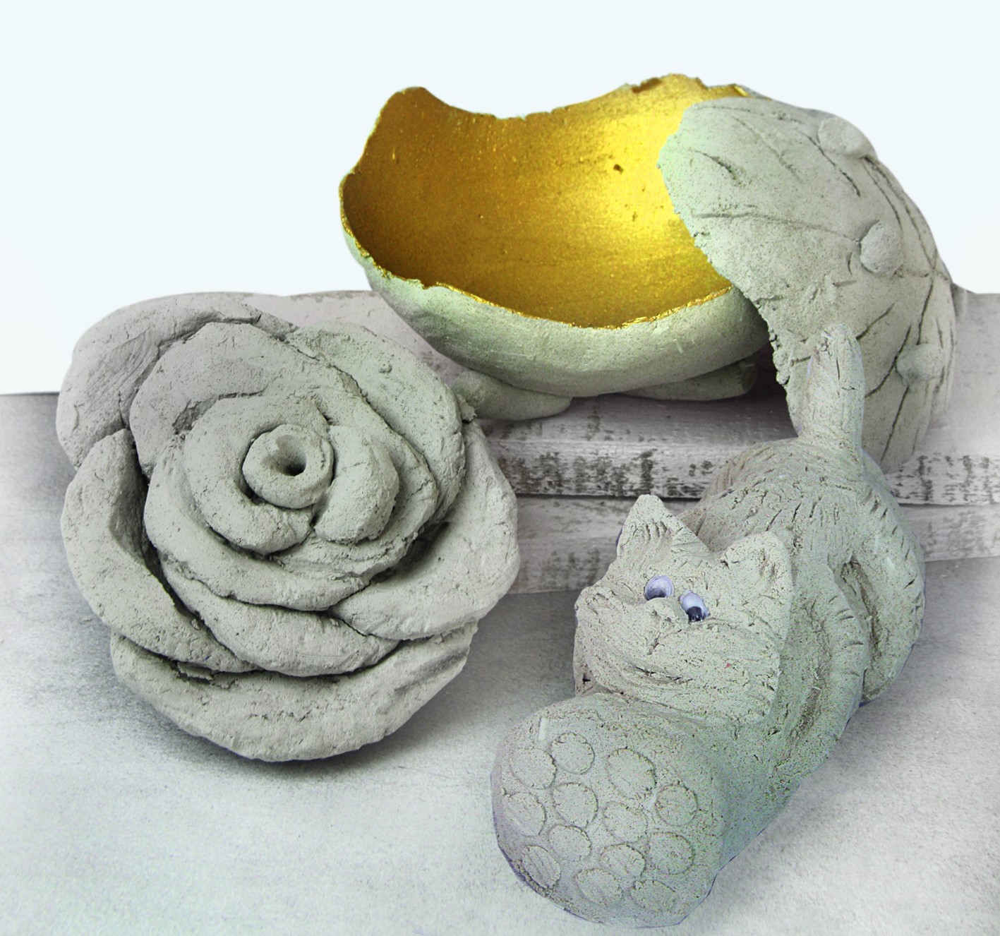 Perfect om uit de kneedmassa praktische gebruiksvoorwerpen zoals schalen, kisten, deurplaatjes, kandelaars en beeldjes te vormen.