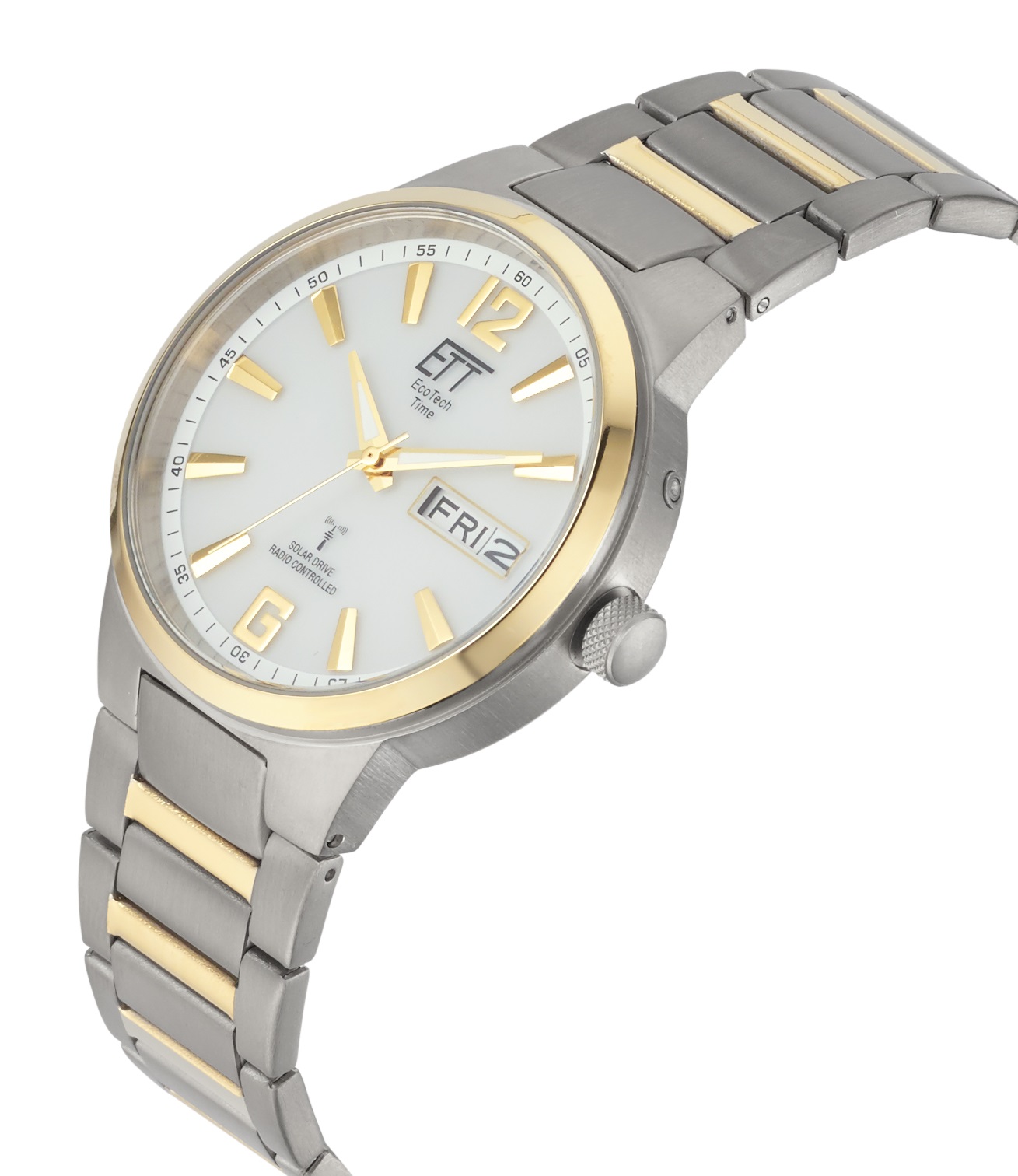 Eine elegante Herrenuhr mit hellem Ziffernblatt und Solar-Funk-Antrieb überzeugt mit ihrem bicolor Design. Die Eco Tech Time Solar Drive Everest II Herrenuhr hat bis zu 6 Monaten Dunkelgangreserve. Das Gehäuse und das Armband der Eco Tech Time Solar Drive Funk Everest II sind aus Titan.