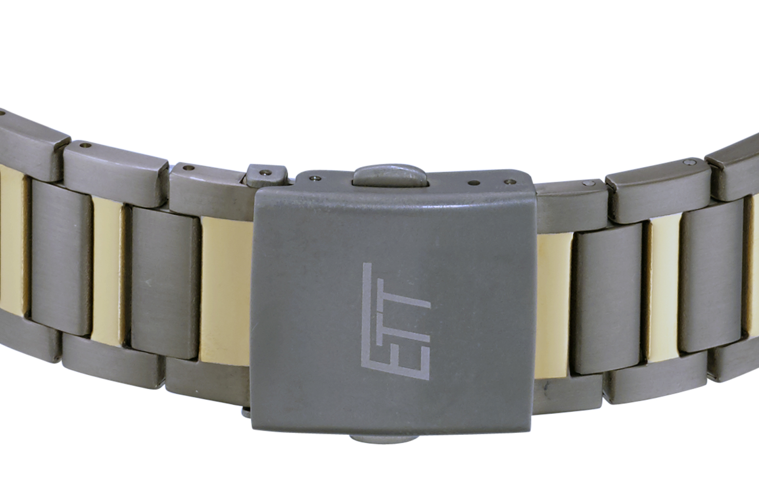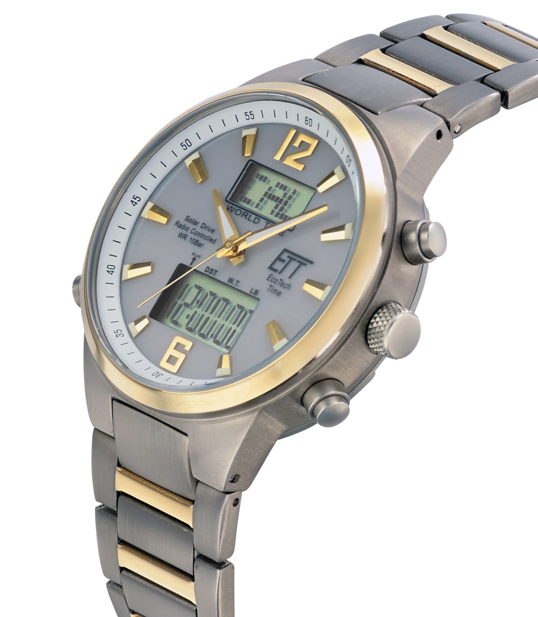 ETT World Timer- Solar Drive Funk Herrenuhr mit elegantem Titangehäuse und -band. Die Eco Tech Time Solar Drive Funk Everest II Titan Herrenuhr EGT-11323-10M ist ein edler Chronograph in bicolorem Design, der über automatische Zeitumstellung, eine Ladezustandsanzeige und eine Stoppuhr verfügt. Die ETT Everest II Titan hat eine Dunkelgangsreserve von bis zu 180 Tagen.
