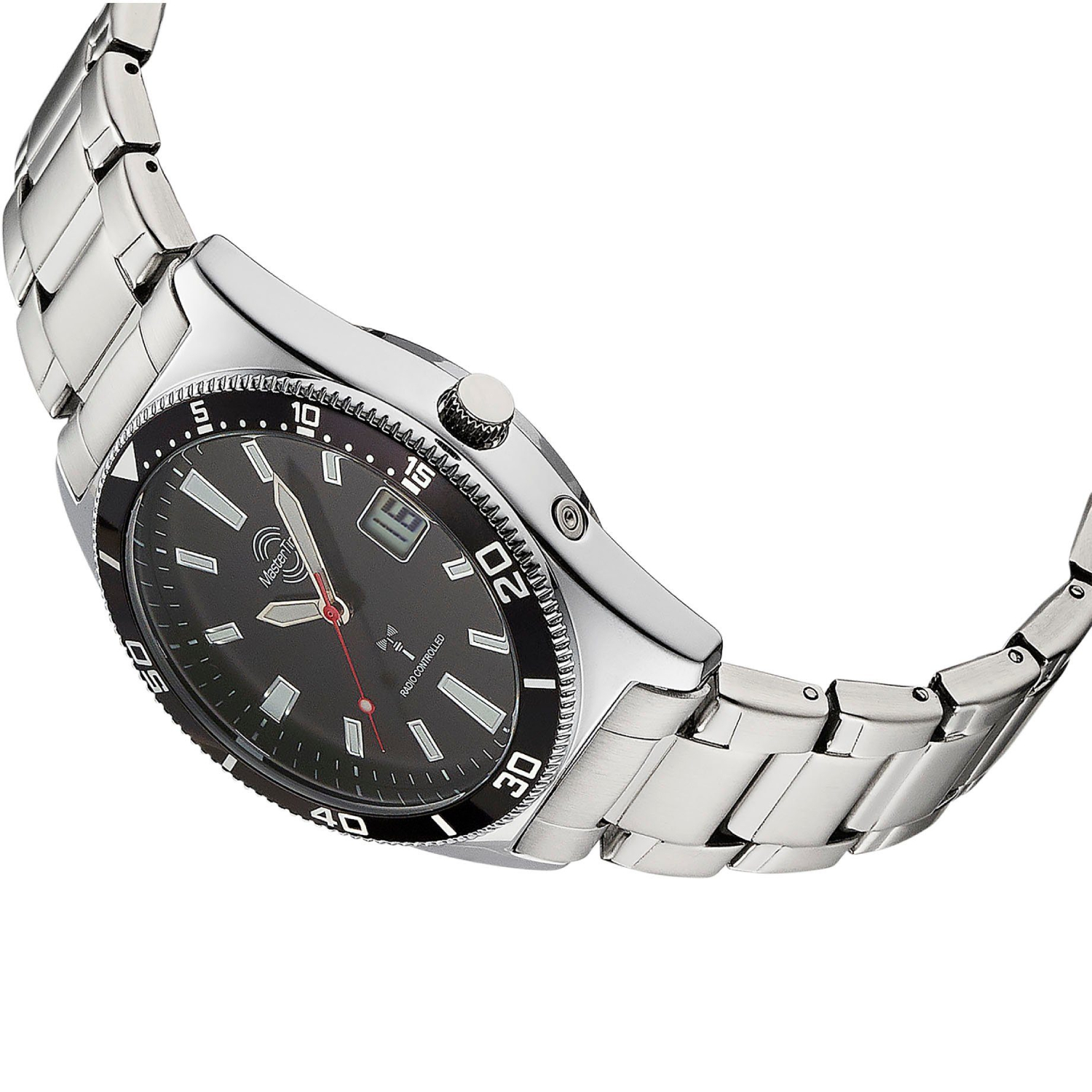 Sportliche Herren Funk Uhr mit schwarzem Zifferblatt und schwarzer Lünette. Neben dem Edelstahlarmband und der Sicherheitsschließe gehören eine Langzeitbatterie (bis zu 10 Jahre Laufzeit) und eine digitale Datumsanzeige zur Ausstattung der Funk Armbanduhr. Das Gehäuse ist bis 5 Bar wasserdicht.