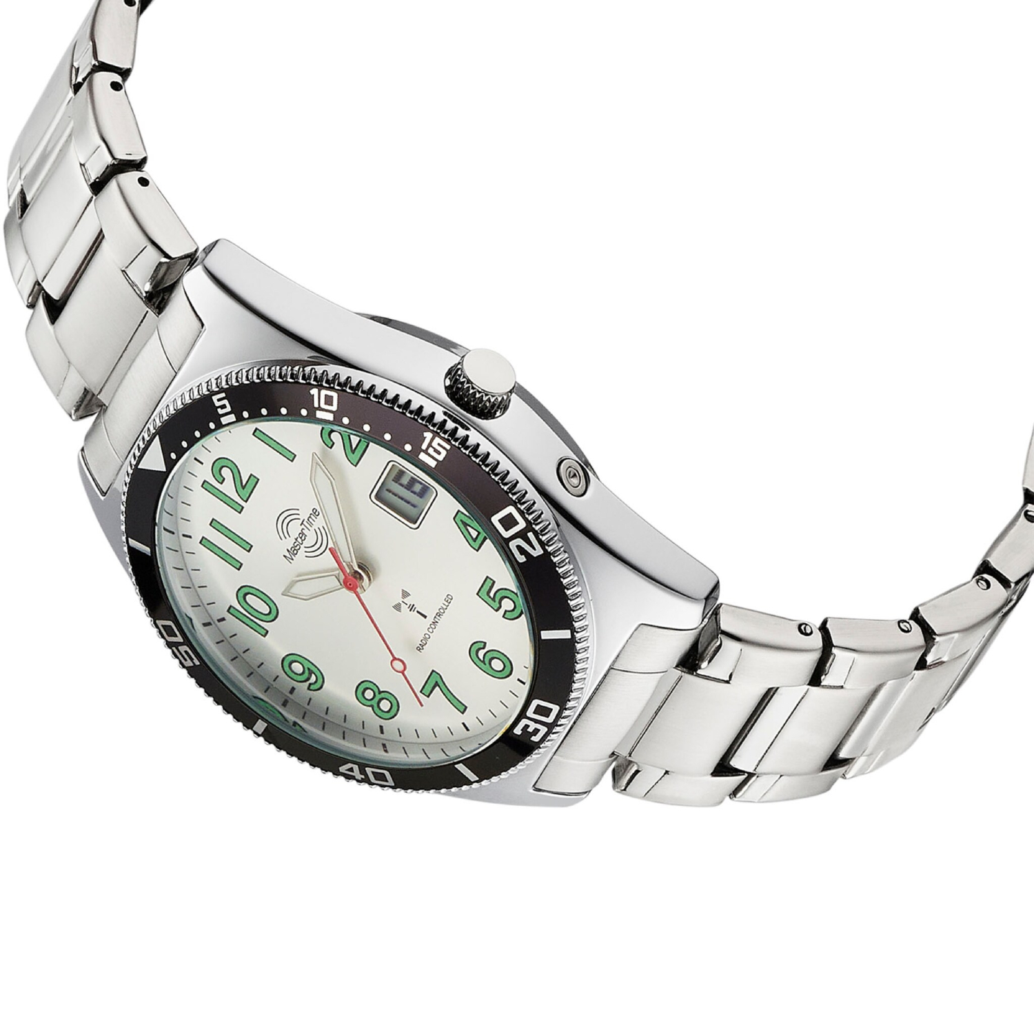Das silberfarbene Zifferblatt dieser Funkuhr ist mit grünen Ziffern und einer digitalen Datumsanzeige ausgestattet. Das Edelstahlarmband besitzt eine Sicherheitsfaltschließe. Neben dem zuverlässigen Funkuhrwerk verfügt diese Herrenuhr über eine Langzeitbatterie (bis 10 Jahre Laufzeit) und ist bis 5 Bar wasserdicht.