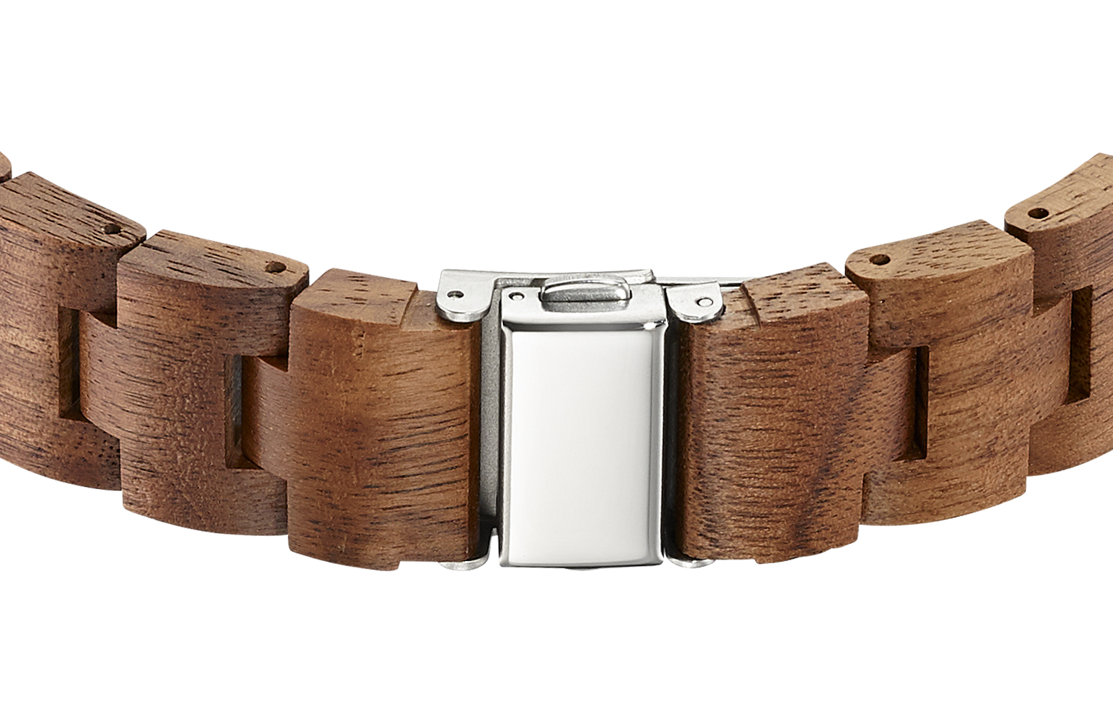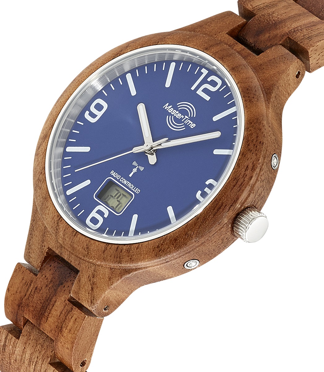 Sportief, modern en up-to-date polshorloge van walnotenhout (kast en band) met blauwe wijzerplaat. Het uurwerk is tijdsein gestuurd, altijd nauwkeurige tijd, eeuwigdurende kalender met dag- en datumweergave en automatische omschakeling van zomer- naar wintertijd. Het horloge is zeer licht en goed afleesbaar, waterdicht tot 3 bar.