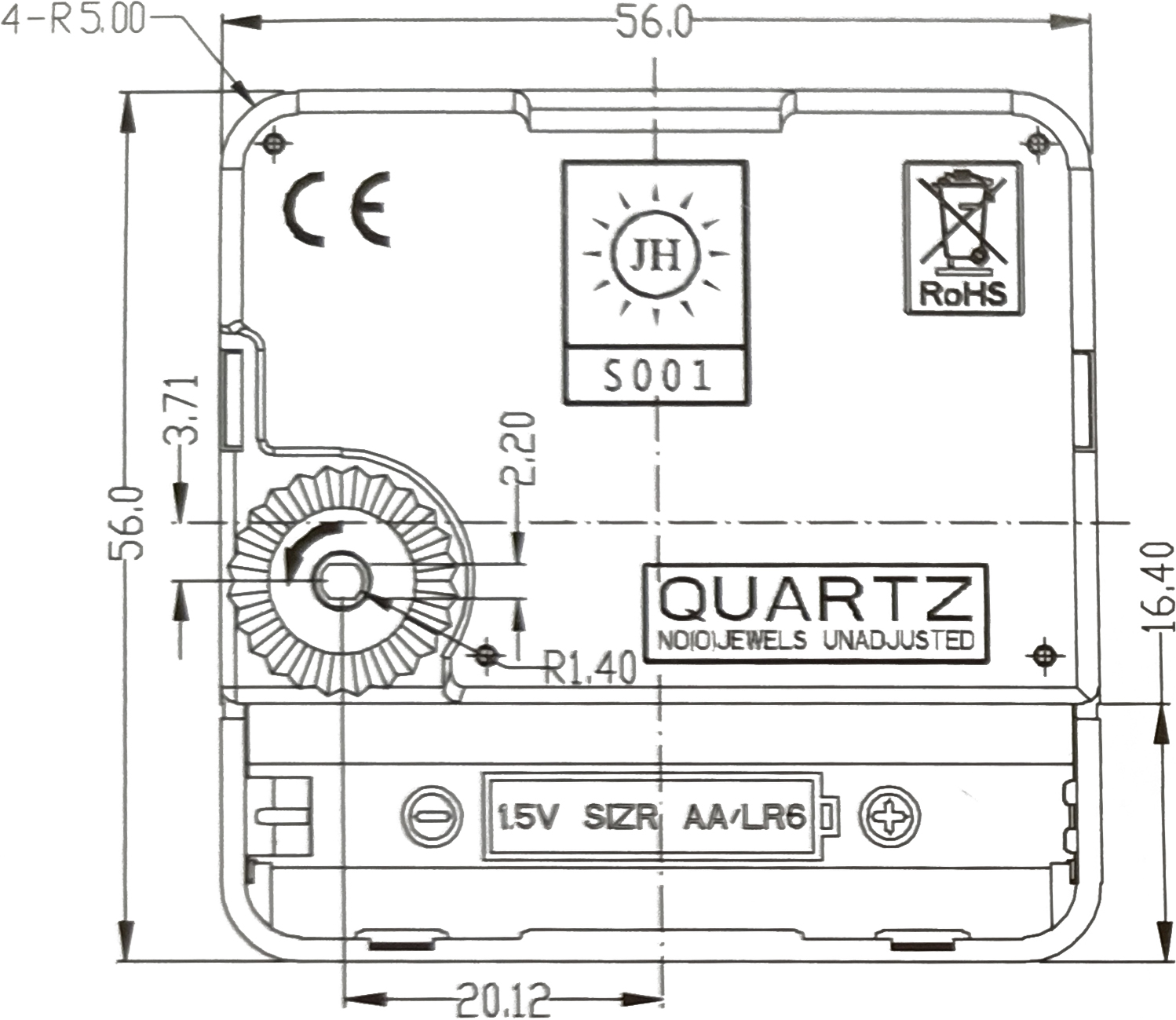 Afmetingen van de uurwerkkast: 56 x 56 x 16 mm