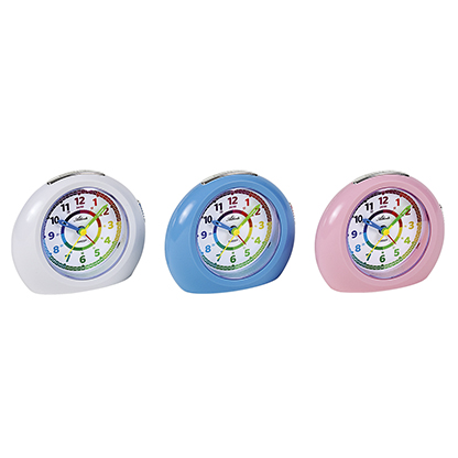 Kwarts wekker, kruipend seconde, herhaling, licht, crescendo, lateraal alarmschakelaar, wijzerplaat om de tijd te leren, bonte wijzers