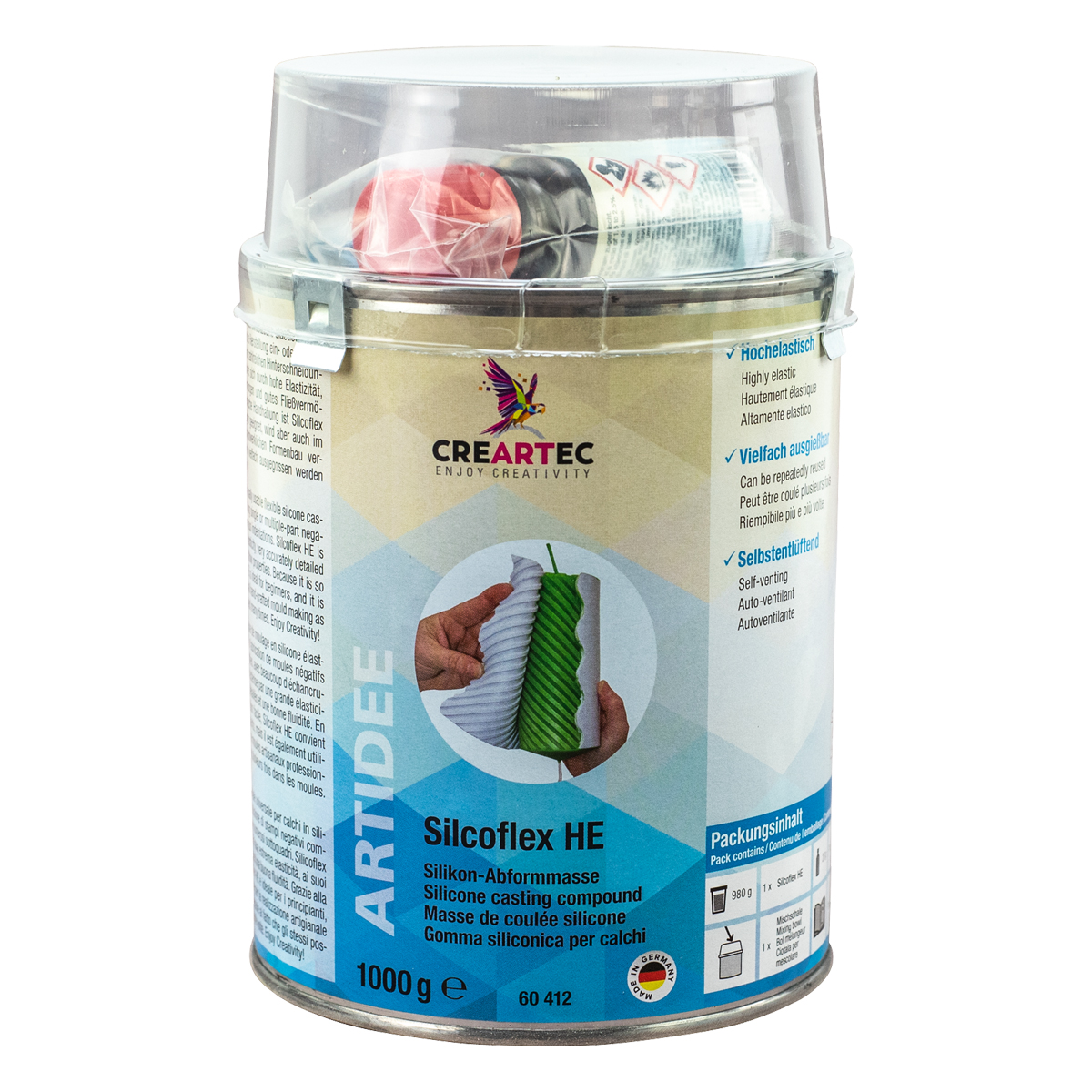 Silicon-Kautschuk HE ist eine großartige, hoch-einreißfeste Spezial-Abformmasse. Es eignet sich als hochwertiges Silicon besonders gut für das Abformen komplizierter Modelle und Konstruktionen, auch solcher mit erheblichen Hinterschneidungen. Dabei ist auch das Anfertigen mehrteiliger Formen im Rahmen des Rapid-Prototyping möglich, wobei mit dieser Methode auch große Skulpturen, auch solche mit Hinterschneidungen, in Form gebracht werden können.